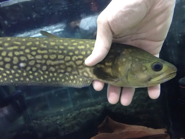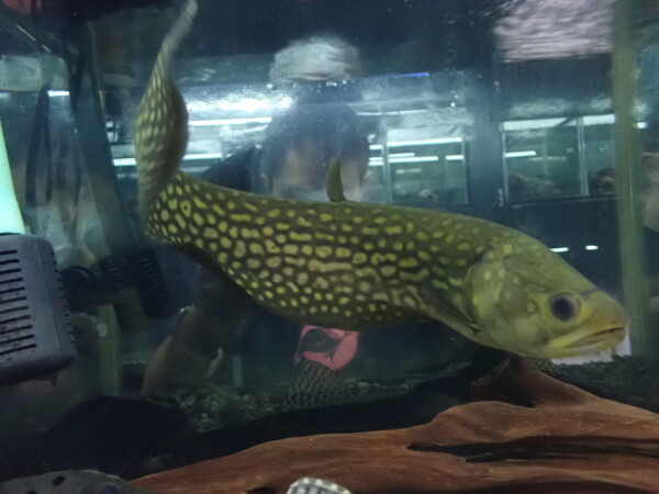 チャド産ということでベルギーのシッパー経由で輸入されたアロワナナイフ。インボイスはスターダストギャラクシーアロワナナイフでした。輸入元の話ではベルギーの業者はチャド産ということで普段アロワナナイフが来るような産地ではないこともあり新種ではないかとノリノリだったらしいですが、やはりと言うかアファーでしたね。でもスターダストギャラクシーなんて名前つけたくなるのも納得な超極美個体。普通フルスポットのタイプはギニアから来ますが、それでもここまでスポットがはっきりしたキレイな個体はまず来ないです。体色の地色は黒ではなくやや黄色っぽい感じでスポットも金色がかってます。1匹しか輸入されていないのでこの発色がチャド産の特徴なのかは判断できかねますが、いずれにしても超ハイレベルな個体なのは間違いないです。アロワナナイフはやや気の荒い魚ですがポリプやプレコなど底物の魚とであれば混泳も問題無いことがほとんどで、店頭でもプレコと混泳させています。サイズも大きくて見ごたえありますのでポリプとかアフリカの魚と混泳させたらかなり良い雰囲気だと思います!マニアの方、ぜひ!!上段、中段左の画像です。3つの画像は同一個体です。