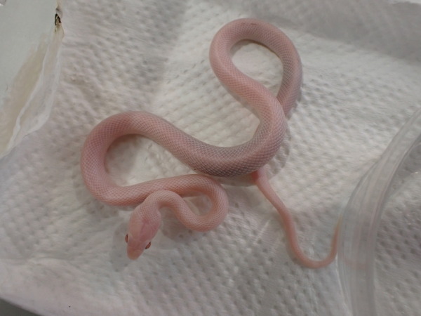 少し前に入荷してアシストで餌をあげてた個体ですが、もう2回連続で自分で食べてますので餌付け完了です!入荷して最初置き餌で食べず、その後からアシスト開始で3~4回アシストしてからまた置き餌にしたら自分で食べるようになりました。一昨日にも餌を与えましたがその時はピンクマウス置いて5分もしないうちに食べてましたので次はピンセットからでも食べそうですね!ブリザードコーンはコーンの品種の中でも何故かハッチサイズが小さいことが多く餌付きも良くない個体が多いです。でも1度餌付いてしまえばもうあとは普通のコーンと同じように飼えますから、餌付いてる個体なら安心です!ブリザードコーンは成長すると本当に真っ白の白ヘビになりますのでキレイですよ!右下の画像です。