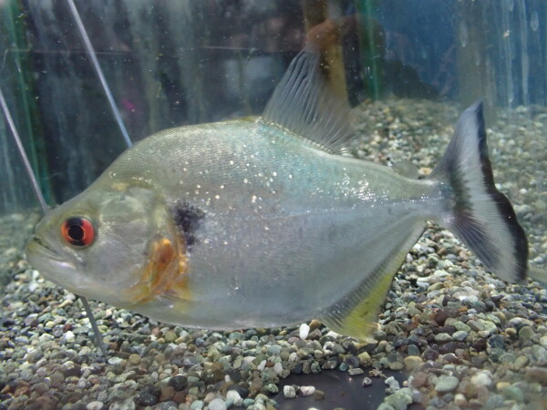 鱗ビカビカで目は真っ赤、エラ蓋から胸ビレの付け根付近がオレンジに染まるキレイなブラックピラニア。今回のサイズも大きめだしすごく良いです!スレなどもなく状態は良好です!右上の画像です。