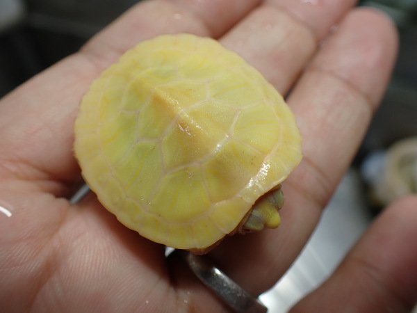 最近「環境省がミドリガメとアメリカザリガニを特定外来生物に指定する方向で議論を進めていく・・・」なんていう話がニュースになってましたね。おそらくどっちも数年のうちに特定外来生物に指定されてしまうんでしょうね・・・。今となって、あの時ガーを買っておけば良かった、ケツギョやナイルパーチを買っておけば良かった、そう思ってる方はかなり多いと思いますし、自分もあの時カミツキガメを手放さず大事に飼っておけばよかったと思っている人間の一人です。そうなる前に、アルビノミドリガメいいなぁと思ってる方は今のうちです!通常¥45000で販売する予定で仕入れた個体ですが、1本爪とびがありました。根元がしっかりしてれば再生するはずですが、サイズが小さいのでよくわかりません・・・。なので現状では¥38000の特価で販売しますが、再生したのが確認できたら元の値段に戻させていただきますので悪しからず・・・。左下の画像です。