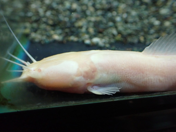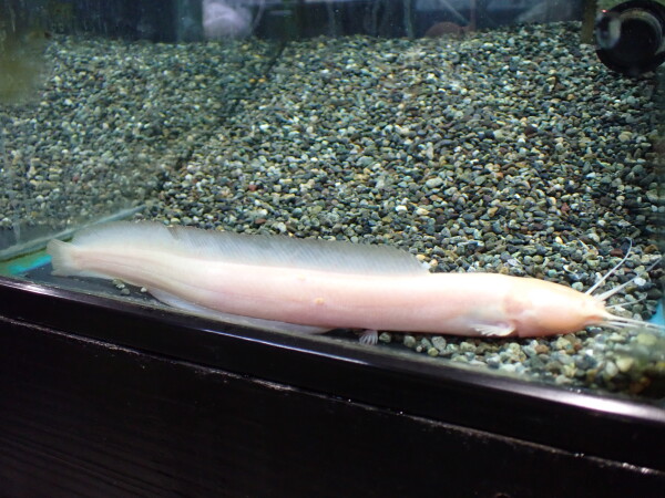 胸ビレある種類のイールキャットのアルビノ個体です。胸ビレ無しのはアルビノも黄変個体も在庫いますし過去にも入荷していましたが、胸ビレある方のアルビノは初めてです!しかもブドウ目ではなく完全な赤目のアルビノです!これは超超激レアですよ!!でもこれ最初に実物見たときイールキャットに見えませんでした。イールキャットにしては体が太すぎで、でもアフリカ産のクララでこんな長い体型のは見たことないしで、頭の中に”?”が浮かびました。でもよく見たら背ビレと尾ビレと臀ビレが繋がっていたのでやっぱりイールキャットだったと確認できましたが、クララとイールキャットの中間みたいな体型で、しかも胸ビレあるから余計にイールキャットっぽくないんですよね。イールキャットにしては極太な個体で、たぶんtypus種ではないと思います。こんな太いとかなり大きくなるんじゃないかと期待してしまいます!ちょっと体側に傷みたいなのがあるのでしばらく様子見てから販売する予定ですが、気になる方はお問い合わせください。入荷は1匹のみ!輸入されたのもこの1匹のみ!マニアの方はお見逃しなく!!上段、中段の画像です。4つの画像は同一個体です。
