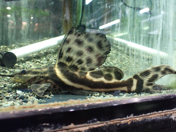 今となっては超激レアなイエローセルフィンです。ここ数年まとまった輸入はなく忘れた頃にポツポツと少数が輸入される程度になっていましたが、今年はバンピラやドラド、レオパードピライーバ等のペルー産ナマズも全く輸入されないような状況だし、ゼブラも少しは来てますが来てるのはコロンビア産やブラジル産でペルー産は全く来てません・・・。そんな中で激レアなイエローセルフィンが輸入されたと聞いてすぐに仕入れました!珍しいナマズだしこんな状況だから値段はちょっと高い気もしますが輸入されたのはこの1匹のみなのでまぁ仕方ないかと。でも仕入れ値を考えるとこれでも特価なんです・・・。今では幻のナマズになりつつある魚。ここ数年の輸入状況や今のペルー産ナマズの流通状況を考えても今後コンスタントに輸入されるようになるということはまずないと思います。数年後にはピラムターバみたいに本当に幻のナマズになっちゃいそうですので、今のうち、いるうちににどうぞ!上段の画像です。2つの画像は同一個体です。