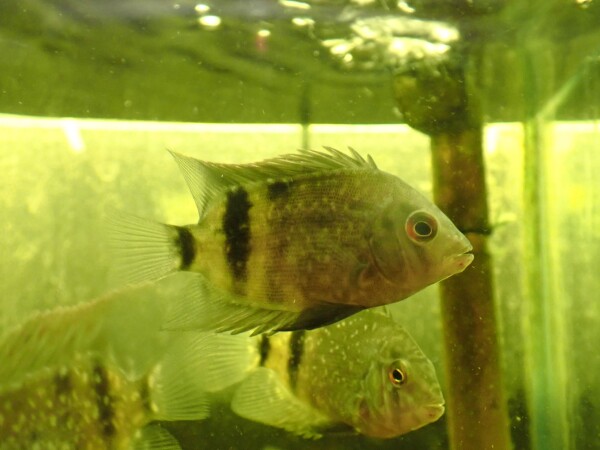 久しぶりの入荷!成長すると白黒のパンダみたいな模様になるトライアングルシクリッドの仲間。輸入直後は状態が不安定なことも多いですが、今回入荷した個体は問屋さんでしばらくストックしてあった個体なので状態もバッチリで安心です!中段左の画像です。