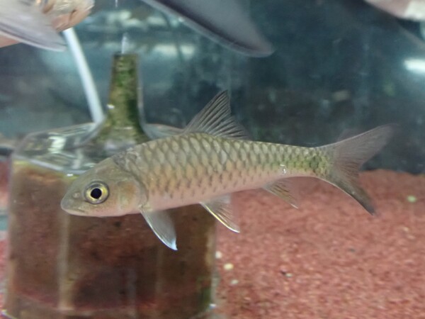 トールspのインボイスで入荷しましたが、おそらくトールシネンシス Tor sinensis だと思います。シネンシスと聞くと中国産を思い浮かべる方も多いと思いますが、実はメコン水系に広く分布している魚みたいです。ただし局所的な分布だったり個体密度がかなり低かったりで熱帯地域からの入荷はかなり稀。中国産は小さいのがたまに輸入されていて値段も全然安いですが、おそらく中国のとは個体群として全く別だと思います。中国のは銀色っぽい体で体側にラインが入りヒレは黄色味がかるような感じですが、タイやミャンマーのはヒレは赤っぽく成魚では側線から下も赤くなります。ミャンマー産のシネンシスは当店初入荷で実際に育てたことがないのでどうなるかは分かりませんが、きっと赤系のキレイなマハシールに成長するはず!入荷は1匹のみ!!右上の画像です。