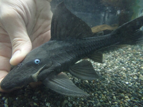 最近ではほとんど輸入されない旧タイプのブルーアイプレコ Panaque cochliodonです。最近流通しているブルーアイプレコ Panaque suttonorumとは種類が違います。旧タイプはコロンビアのマグダレナ川の上流に分布しており体色は黒っぽく目の色も少し濃いめ。さらに体型はややスマートで体高が低く顔は尖り気味。最近流通しているベネズエラ産のブルーアイプレコは体色が灰色で目の色は水色っぽい感じ、体高は高めでややずんぐりした体型をしています。違いの微妙な個体もいますが、特徴的な個体は見比べると全然違いますね。古くからのマニアの方であれば黒っぽくて目の色が濃いの昔のブルーアイと最近のブルーアイプレコが違う魚だということをご存じの方も多いと思いますが、旧タイプのブルーアイ、やっぱり良いですよね!!中段左の画像です。