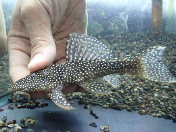 トカンチンス水系のはコロンビアのスーパーブラックドラゴンスタークラウンと違って体色はこげ茶色でスポットはクリーム色になるはずですが、この個体は体色が黒っぽくてスポット白いですね。でもスポットはすごい細かいのでスーパーブラックドラゴンスタークラウンとは雰囲気が全然違います。ちょっと変わった個体ですね!サイズ大きい割にお買い得で超オススメです!中段右の画像です。