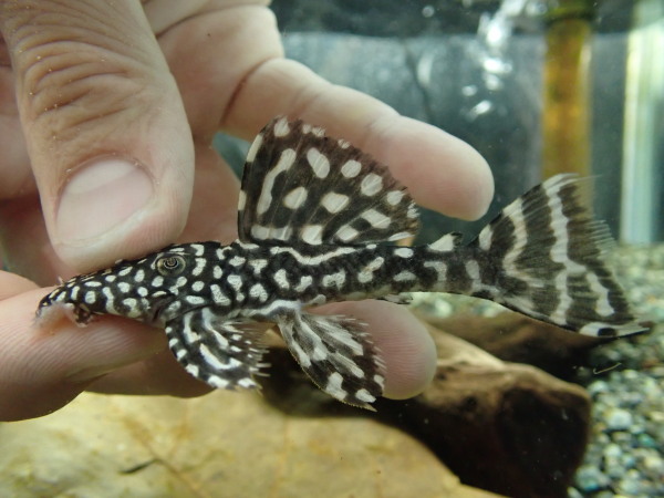 超小さい・・・。3cm位の極小ベビーです。でもアグアはプレコの中では成長の早い種類なので飼育下でもちゃんと大きくなりますよ!このサイズから育ててみてください!中段右の画像です。