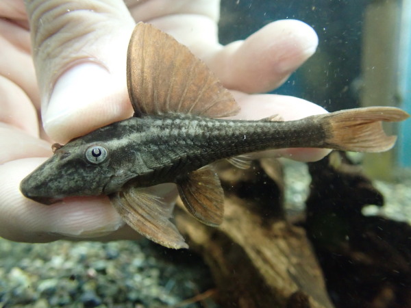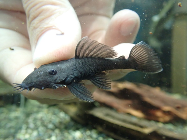 ヒゲもじゃで妖怪みたいなプレコ。大きくて平たい頭がしゃもじみたいでキモかわいいです!今回来たの小さいですが既にヒゲもじゃなのでオスですね!中段右の画像です。