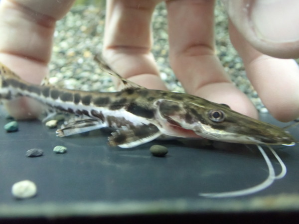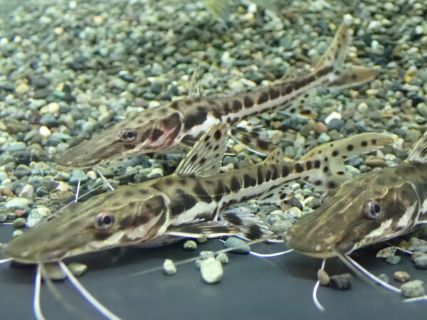 上段の画像です。左上の画像は水槽に入れて1日経った状態の画像で右上の画像は入荷直後の画像です。落ち着いて色が出た状態だと全体的に体色も濃くなりスポットも大きくなりますが、入荷直後の色が飛んだ状態だとかなりピンタードの特徴が出ていますね。
