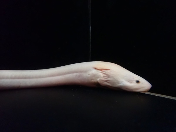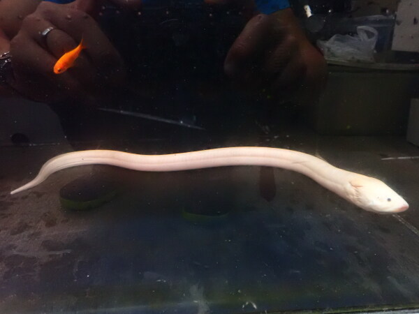 超レア!真っ白シミ無しのプラチナタウナギが入荷しました!アルビノや黄変個体、3色のキャリコなどの色変わりは過去に入荷したことがありますが、真っ白のプラチナは初めてです!超キレイで超神々しいです!こいつはタウナギの神様かもしれません!?もちろん入荷は1匹のみです!マニア必見!!上段、中段左の画像です。3つの画像は同一個体です。