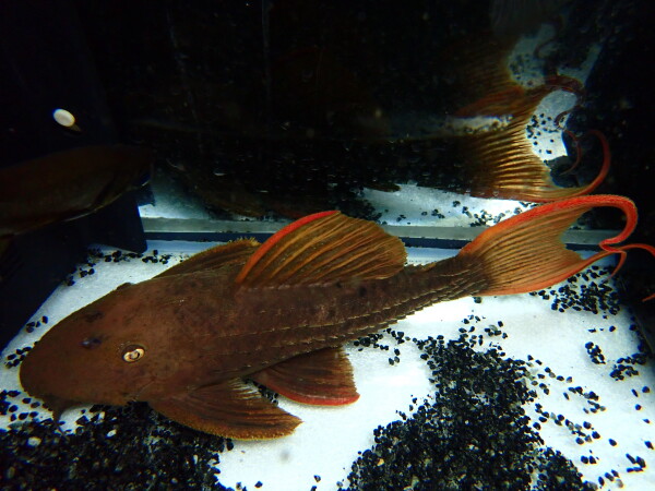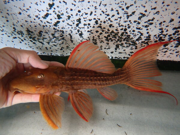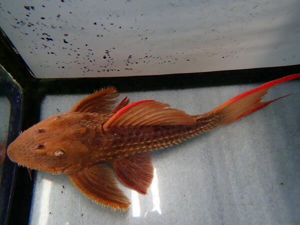 ヒレ先にほんのちょっとだけシミがありますが、ほぼシミ無しの極上個体です!ただしゴールデンダルマの体色はちょっと不安定な形質で、飼ってる間に黒くなってしまう個体もいます。もちろん黄色いままで黒くならない個体もいます。ただ黒くなったりシミが増えたりしても、また飼ってるうちに急に黄色くなり始めたりする不思議なプレコです。