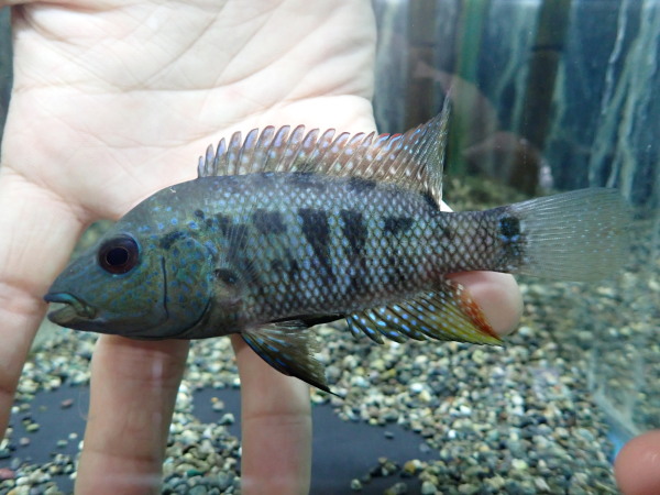 入荷の少ないレアなシクリッドです。既にメタリックブルーのスポットがびっしだし額も少し張り出していてオスっぽい顔つきしてます!これからどんどんキレイになっていきますよ!入荷は1匹のみです!左上の画像です。
