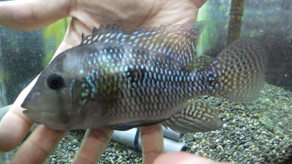 パールシクリッドとも呼ばれる体側のメタリックブルーのスポットがキレイなシクリッド。サイズ大きめなワイルド個体ですが、少し穴あきがあるので超特価!このサイズのワイルド個体がこの値段は超お買い得です!穴あきもそんなにひどいわけではありませんので気にならない方はぜひ!!右上、中段左の画像です。2つの画像は同一個体です。