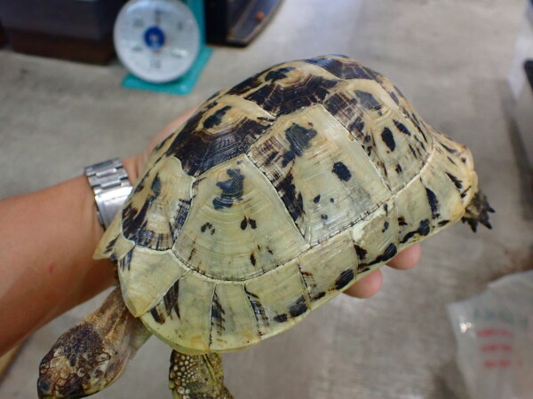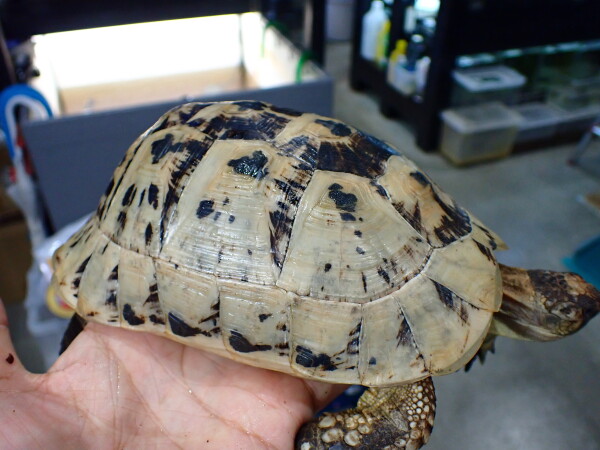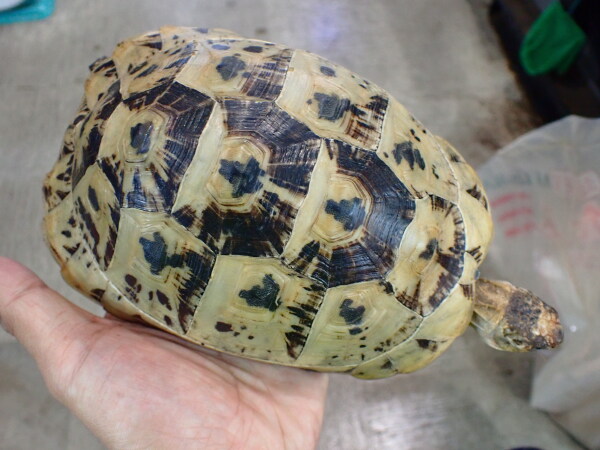 普通のキレナイカは明色部がもっと黄色っぽいんですがこの個体はかなり白っぽいです。しかもこいつは白勝ちな極美個体です!さらに甲羅もツルツルでシルエットもすごくキレイ!輸入されてから数か月ストックされていた個体なので餌食いも良く状態は良好です。右前足の一番内側の爪がありませんが、爪が欠けたとか欠損したようには見えないのでもともと1本無いんだと思います。ギリシャとかヘルマンはたまに前足の爪4本の個体いますし、全然違和感無いから個人的には全く気にならないです。キレナイカはもともと輸入量少ないですからね、ここまでの個体となるとそうはお目にかかれないのでは??これだけキレイな個体なら1匹だけでペット的に飼ってもいいですが、オスをお持ちの方はぜひ繁殖を狙っていただきたいですね!画像は全て同一個体です。
