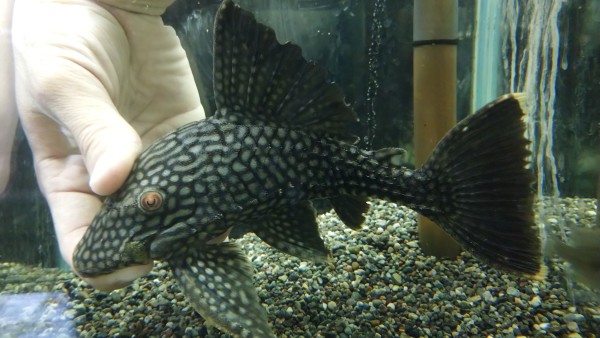 変わった模様のロイヤルもいます。スポットでもラインでもない唐草模様のような不思議な模様のロイヤルプレコ。これも1匹のみです!!右下の画像です。