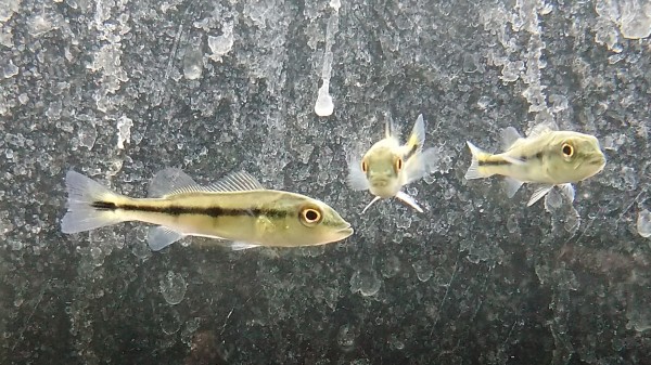 輸入数が少なかったようで1店舗1匹までって言われちゃいました・・・。なので1匹しかいないので早い者勝ち!!今回のは前回のとタイプ違いますね!現状で体側の模様がほぼ入らずヒレははっきりと赤く発色しています!そして一番気になるポイントは口元が緑色ということ!アミアのオスは婚姻色で緑に発色するのはよく知られているところですが、オスかメスかもわからないこんな小さいサイズで口元がはっきりと緑に発色しているアミアなんて初めて見ました!こういう素晴らしい個体が1匹しか仕入れられないというのが本当に残念ですが、とりあえず早い者勝ち!!上段の画像です。2つの画像は同一個体です。