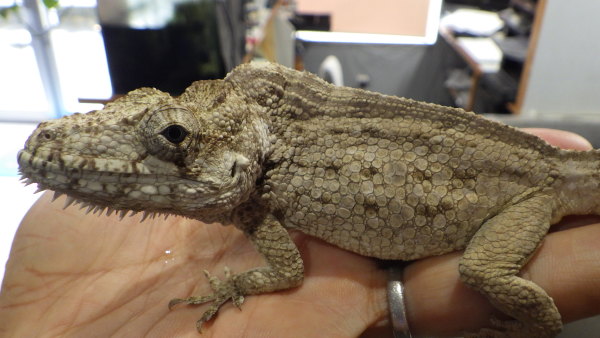 こっちは動きもスローで取り扱いも楽です。手触りももっちりとした感じでついハンドリングしたくなるトカゲ。カメレオンモドキはカメレオンではないので舌は伸びませんが、左右同時に別々の場所を見られる目や顔つきはまるでカメレオン!飼育も難しくありません!下段の画像です。