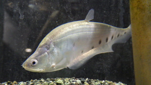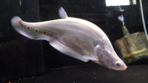 本物のプラチナ個体入荷!プラチナナイフの入荷はかなり久しぶり!当店への入荷はたぶん4~5年ぶりじゃないかな??ビカビカのプラチナシルバーの発色がすごくキレイな個体です!顔回りやヒレの付け根付近などはすでに銀色の粉を吹いたような発色をしていますし、成長するとこの粉を吹いたような色がさらに厚く発色し、体側のスポットも薄くなっていくと思います!!今でも十分キレイですが、40~50cmに成長するころには見違えるような魚に仕上がってると思いますよ!白水槽やクリアの水槽に入れて色が飛んでるだけの個体ではないことがお分かりいただけるように店頭では4面黒の水槽に入れてありますが、もちろん白水槽に入れてあげればさらに真っ白のビカビカな状態になりますよ!上段の画像です。2つの画像は同一個体です。