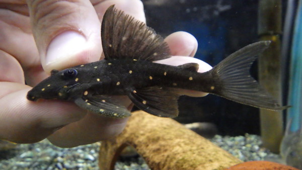 チョコレートブラウンの体にオレンジのスポットがキレイなプレコ。尾ビレの上下もピンと伸びてくるのでシルエットもかなりカッコいいです!個人的にも好きな種類なのでオススメです!。右上の画像です。