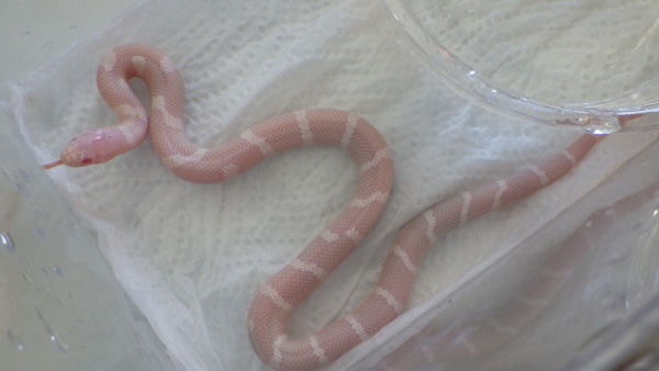 カリフォルニアキングスネーク アルビノデザートバンデッド ちょい尾曲りの為特価 左下の画像