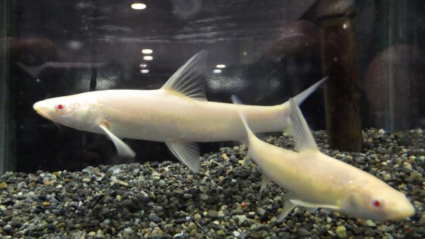 中東原産の超カッコいい大型のコイ、Luciobarbus brachycephalusのアルビノ。以前は高額な大型個体が輸入されたりもしましたが、今では不定期ではありますがたまに今回のようなサイズのブリード個体が輸入され流通していますね。また、情報が少なかった頃はコレイウスという別のコイの名前で流通していたことも・・・。そんなルシオバルブス、スレンダーな体型と精悍な顔つきが超かっこよくいて、しかもアルビノはその体色が神々しく、とても魅力的です!このルシオバルブスという属にはマンガルと呼ばれる L.esocinus など他にも魅力的な魚がいっぱいいますので、今後の輸入に期待したいですね!上段の画像です。