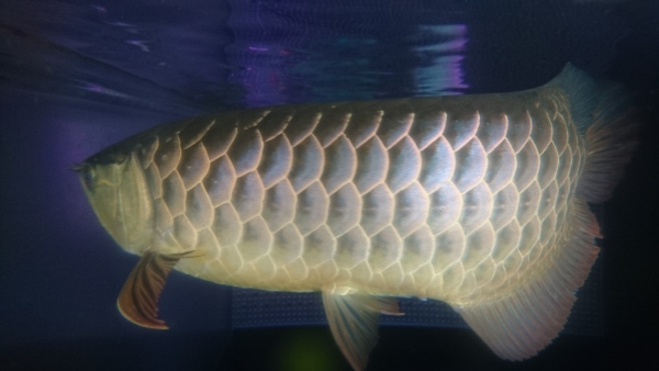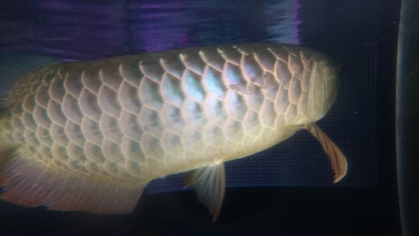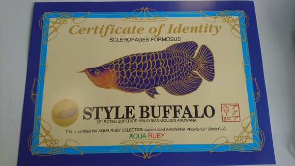 お客様からの下取り個体になります。もちろんスタイルバッファローの証明書も付属しております。証明書の裏にはアクアルビーさんの捺印とマイクロチップナンバーの記載があります。マイクロチップは確認済みで、個体に埋められたチップのナンバーと証明書に記載されたチップのナンバーは一致しておりますので、証明書の個体で間違いありません。ややヒゲがクロスしておりますが、これは時間が経てば自然に治ることがほとんどですのでそんなに気にならないと思います。ただしどれくらの期間で治るというのは言えませんので悪しからず・・・。それと、もともとアロワナ同士で混泳していた個体なのですが、その時に一部の鱗の縁が欠けてしまったようです。これも自然に治る場合が多いですが、気になる場合は麻酔をかけて抜いてしまえば確実に再生します。目垂れやアゴズレ、エラ捲れ等の欠点はありません。画像が悪いので個体の良さが伝わらず残念ですが、実物は画像よりも青いし、全然かっこいい良いアロワナですよ!ぜひ実物を見に来てください!!餌食いもすごく良い個体で、金魚でもワームでもバクバク食べますので、しっかり餌をあげて飼い込んであげればこれから体高も増してまさにスタイルバッファローな体型に仕上がると思います!本来は超高級な有名ブランドの過背金龍です!こんな値段で手に入るチャンスは今後ないかもしれませんよ!!