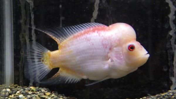 フラワーホーンがもう1匹。こいつはコブがあんまり出ていないのでメスかもしれませんね。体色は全身白一色!真っ白のフラワーホーンです!コブが出てないのがちょっと残念ですが全身真っ白で一切模様が無い個体は初めて見ました!値段は安いですがかなり珍しいと思います!同時に入荷した個体とペアなのかも??右下の画像です。