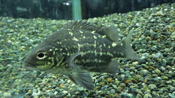 カルボナンダスかっこいいですね!黒っぽい体色に金色のまだら模様がすごくキレイです!図鑑なんかで調べると汽水で飼いましょうって書いてあることが多いですが、意外と純淡水でも飼えちゃいますよ!大きい個体が輸入されることはほとんどありませんが、大きい個体は迫力があって超カッコいいんです!がんばって大きく育ててください!!左下の画像です。