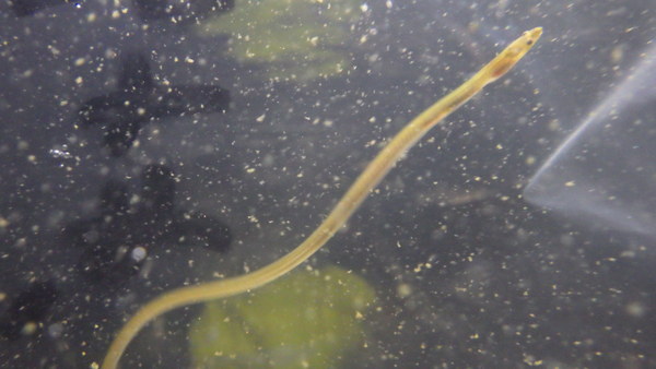 インド産のシラスウナギということで入荷しましたが、水槽入れてよく見たらどうやらウミヘビの1種のようです。種類は分かりませんが、ホタテウミヘビ?ゴマホタテウミヘビ?まぁその辺の種類だろうと思います。純淡水でも飼える面白い魚ですよ。水槽入れるとすぐどこかに隠れてしまい、飼ってることを忘れてしまいがちですが、たまに出てきた時にちょっと大きくなてたりすると楽しいんですよね!?左下の画像です。