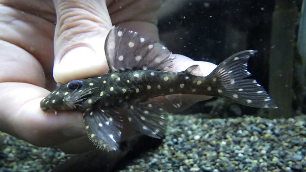 イエロースポットスタークラウンとかイエロースポットスターペコルティアとかいろんな名前で流通しますが、基本的には同じ魚です。黒い体に黄色いスポットが入るかわいいプレコで、サイズも10cm程にしかなりません。丈夫で飼い易い種類なのでオススメですよ!中段左の画像です。