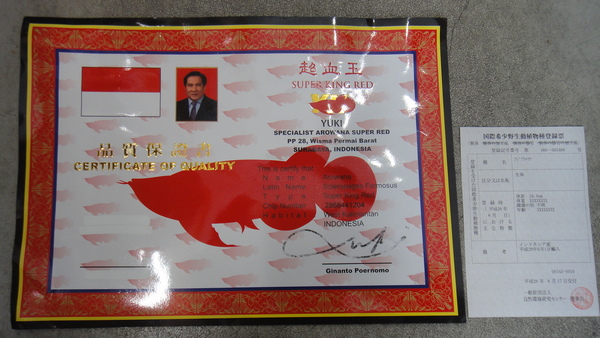 SURABAYA YUKI SUPER KING RED 超血王 の入荷です。サイズは40cm位で既に発色しておりますが、まだ2歳の若い個体ですのでこれからもっと発色しますよ!普段当店では取り扱っていないブランドのアロワナですが、今回はお客様からの下取り個体として入荷しました。通常であれば幼魚でも50万以上はする超高級アロワナですが、今回は下取り個体ということで普通では考えられないような超特価で販売致します!もちろんスラバヤ・ユキの直筆サイン入りの証明書も付属しますし、証明書のマイクロチップナンバーと個体のマイクロチップナンバーも一致している本物個体です。高級アロワナはネットオークションの個人売買で証明書を入れ替えたニセモノが売られてたりすることもあるみたいだから要注意ですね!目垂れやアゴずれなどの気になる欠点もありませんし、餌食いも良好です。画像では赤いアロワナ用の水中LEDライトを使っています。とてもキレイでお買い得なアロワナですよ!