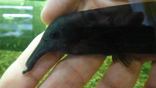 クルビロのインボイスで入荷したモルミルスです。クルビロにしては吻がまだ短く、現状ではまだちょっと何とも言えない感じです・・・。ただリンコやヌメニウスとも違うようなので、飼い込んで育ててみる価値はありますね!吻が伸びるタイミングというのは個体差があり、小さくてもそこそこ伸びてる個体もいれば大きくなってから伸びる個体もいたりでこの辺は判断の難しい所・・・。今回入荷した個体は体色もまっ黒でこれはクルビロの特徴でもあります。ヌメやリンコでは体側後方のバンド模様がしっかりと確認できる個体がほとんどですが、クルビロでは興奮時にうっすらと浮かび上がる程度で平常時からバンドが明確に確認できる個体はほとんどいませんからね。個人的には吻の伸びるタイミングが遅いクルビロなんじゃないかなと予想してみました。今後成長につれて伸びてくることを期待です!!本当は高いんですが、そんな不確定な要素を含んだ個体なので、カンピロモルミルスspとして特価で販売します!マニアの方、気になる方はぜひ!!中段、下段の画像です。中段の画像の個体は画像アップ前に売約となりました。下段の画像の個体はまだ在庫ありますが、少々肌荒れしておりますので、販売はトリートメントが済んでからになりますのでご了承下さい。