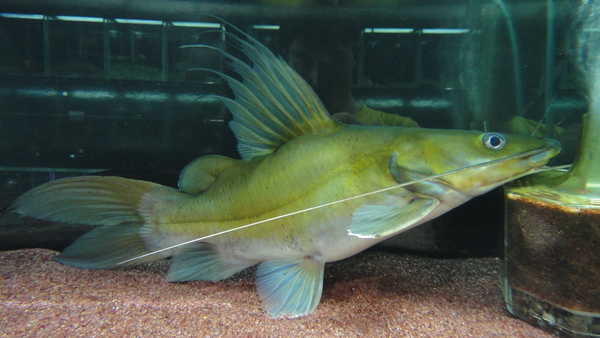 これすごいですよ!アフリカのバグルスフィラメントーサスはたまに輸入されてるからナマズマニアの方なら知ってる方も多いと思いますが、今回ご紹介するのはそれとは違うフィラメント伸びちゃう系のバグルスで、タイとか東南アジアに生息するヘミバグルスフィラメントスです!しかもそれの超キレイなショートボディ!!ノーマル体型の個体であっても過去に国内に輸入があったかは微妙。もしあったとしても多分イエローミスタスとか他のナマズに混じって来てたことがあったかもしれない位だと思いますのでかなりの希少種だと思います。ショートボディに興味のない方もいらっしゃるかと思いますので、これがノーマルボディだったら欲しかったという方も多いかもしれませんが、すいません、今回はこのショート個体1匹しか発見できませんでした。でも現地でも単独で大事にストックされていただけあって魚の状態、クオリティは抜群です!欠点や不自然な歪みの無いパーフェクトなショートで、デフォルメされた戦闘機みたいな形です!?現地で見た時は真っ黒でしたが、当店の水槽では明るいオリーブグリーンに発色してとてもキレイです!ショートマニア、ナマズマニアは必見です!!こんなのもう2度とお目にかかれないと思いますよ!!上段の画像です。2つの画像は同一個体です。