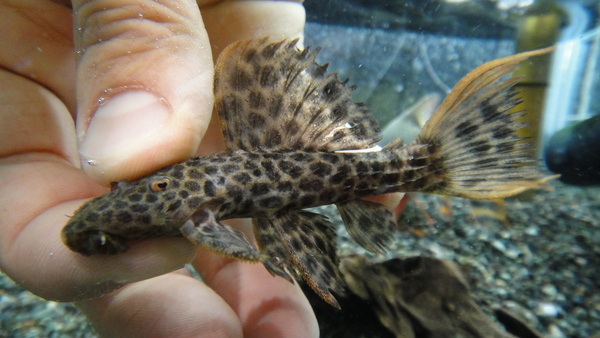 普通のオレンジフィンレオパードトリムなのでソリッドテールとかではありませんが、体側のヒョウ柄模様とかヒレの条のオレンジとかがキレイですね!トリムプレコの中でも成長の良い種類なので大きくしやすいですし、丈夫で飼い易いです!値段は高くなりますが、ブランコ産のスーパーオレンジフィンレオパードトリムも在庫ございますのでお好きな方をどうぞ!中段左の画像です。