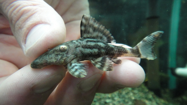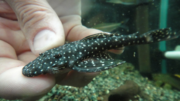平べったい体型と細かい青白いスポットが特徴のかっこいいプレコです。大型個体は胸ビレの棘が発達してすごく迫力あります!右下の画像です。