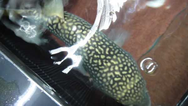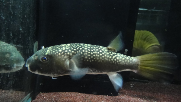 ちょっと前にこれの小さいやつだということで入荷した個体がいましたが、幼魚色?なのかちょっと模様の感じが違いましたが、今回は大きいサイズで入荷しましたのでイメージ通りのこれぞゴールデンスポットブラックパファーという感じのキレイな個体が入荷しました!着状態も良好で肌荒れやヒレ溶けも一切ありません!真っ黒の背中に緑がかったメタリックなゴールドスポットがとても美しいフグです。淡水でも大丈夫という話も聞きますが心配なので当店では汽水(1/4~1/5海水)でストックしています。滅多に輸入されない希少な淡水フグで、前回入荷の小さい個体も問い合わせ多数で即売れでしたので、前回買いそびれてしまった方はお見逃しなく!このサイズ1匹のみ!上段の画像です。2つの画像は同一個体です。