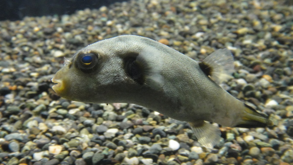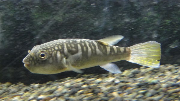 インドからタージマハルパファーのインボイスで輸入されたフグで、実物を見ないままなんか珍しそうだなと思って仕入れたんですが、来てみたらコクテンフグでした。海水魚として流通することが多いフグですが、幼魚期には汽水域で生活していることも多い種類で、そういった環境で採集された個体であれば汽水での飼育も可能です。海水魚で売られてる個体はもちろん海水で飼育してあげる必要がありますが、今回は汽水で入荷してますので無理に慣らしたりしないでも最初から問題無く汽水で飼育してあげられるのでうれしいですね!しかもかなり薄い塩分濃度で飼育中です!すごく顔がかわいいフグで犬みたいな顔からドッグフェイスパファーなんて呼ばれることもあるそうです!汽水で飼育できるコクテンフグの入荷は結構少ないと思いますよ!オススメです!中段左の画像です。