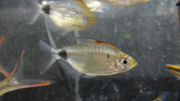 そんなに高くないけどとってもキレイなカラシンです。体高のある体型と背中の濃い赤の発色が特徴です。レッドチェリーやゴールデンコンゴみたいなレア種ではありませんが、なんかすごく久しぶりに仕入れた気がします。うちの店ではとっても珍しいですね!?左下の画像です。