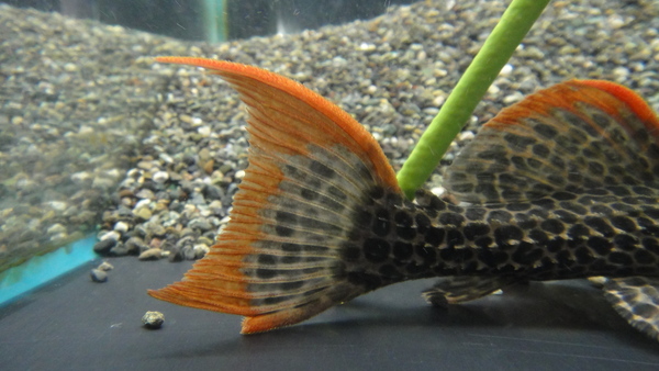 ブランコ産のスーパーオレンジフィンレオパード入荷です。派手めで人気のトリムです。尾ビレの一番下の条が一部欠損しております。たぶん再生してくるとは思いますがヒレの状態は画像でご確認下さい。ヒレ欠けの分特価にさせてもらっていますのでお買い得だと思いますよ!中段の画像です。2つの画像は同一個体です。