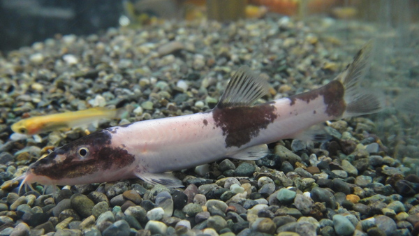 Sinocyclocheilus sp です。この属かなりの大所帯。50種ほどが記載されていますが中国では保護の対象のためほとんど輸入されることのない希少な魚です。以前にもこれの仲間が入荷しましたが、それは目がある種類でした。今回入荷したのは目が退化してしまった完全洞窟棲の種類です。今回入荷したような種類こそが洞窟魚のイメージにぴったりの魚だと思うんですが、見た目超キモいです!超キモくて超良いんです!!以前に入荷した目のあるやつも全然売れないでまだ在庫でいます、しかも2匹も・・・。だからたぶんこれも売れ残るんでしょうが、全然構いません!だってこんな深海魚みたいなキモい魚、売らずに趣味で飼っててもいいと思ってますから!?今回この目の無いのも2匹入荷してます。目のあるのもそうだったのですが、雌雄差なのか体型(体高)や体色がかなり違います。乳白色で体高のある個体とやや灰色っぽくて少し体高が低い個体といます。中国の研究施設では繁殖にも成功してるらしいので、せっかくなら2匹セットで繁殖狙ってみたいですね!?上段の画像です。左上が10cm位のちょっと灰色っぽい個体で、右上が12cm位の白っぽくて少し体高の高い個体です。