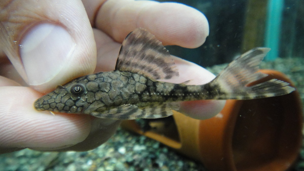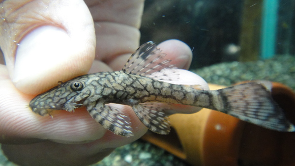 アラグアイア上流産のスネークスキンです。輸入元によるとこの産地のスネークスキンは成長につれて体色が黄色っぽくなりこのプレコの特徴でもあるヘビの鱗のような模様がよりはっきりするそうです。店頭にはトカンチンス水系産の個体も在庫でいるので売れ残ったらどれ位の違いがでるのか比べて見ようと思います!中段右の画像です。