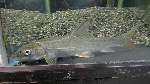スノートラウトとはSchizothorax属とSchizothoraichthys属に属するコイ科の魚の総称で、全部で30種類以上は記載されているらしいです。基本的に冷水性の魚になりますが、今回入荷した種類は何ていう種類かは分かりませんが、どうもスノートラウトの仲間の中では高水温に対する順応性が高いようで、店頭では水温25度以上でも普通に状態良さそうに泳いでいます。試しに餌(ランチュウベビーゴールド)をあげてみたらまだ食べなかったけど反応して口に入れたり出したりしてました。たぶん2~3日中には食べるようになりそうですね。上限で何度まで耐えられるかは分かりませんが、水槽用クーラーが無くても水槽用の扇風機程度で意外と普通に飼えるかもしれませんね?下段の画像です。2つの画像は同一個体です。