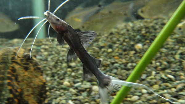 ナイスサイズの超カッコいいブラックイールテールキャットが入荷!34~35cmありますのでなかなかの迫力です!純淡水で入荷しましたが、さすがにこのサイズで淡水はちょっと心配なので今は少し塩入れてます。最大で1m以上になる大型のゴンズイで、海水域から汽水域にかけて生息しているのですが、淡水域まで上がることもあるようで、淡水域で採集された個体が熱帯魚ルートで稀に輸入されたりします。少し前に小さいベビーが入荷しましたが、こういう大きいサイズは本当に久しぶりです!この魚大きくなるとすごいんですよ!大型個体はもうまるっきり妖怪です!Plotosus caniusの学名で画像検索してみて下さい!すごい妖怪が見られます!こんな妖怪チックな大きいサイズには超憧れちゃいます!こんなの飼ってみたいですね!