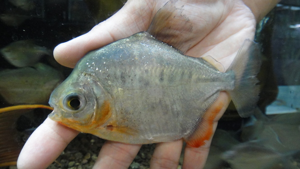 すごく変わった面白いパクーが入荷しました。カウアのような体型ですが、顔が全然違います。なんか丸っこくて鼻先が厚い顔をしています。前にデミニ産のジャイアントパクーっていうのが入荷したことがありましたが、あれに似てる気がしますね。体側には分かりにくいですが少し黒っぽいシミが出ていて、ヒレの発色は臀ビレだけじゃなく、尾ビレも赤っぽくなっていますので、飼い込めばもっと派手になりそうです!輸入されたのはこの1匹のみです!マニアの方はお見逃しなく!!左上の画像です。