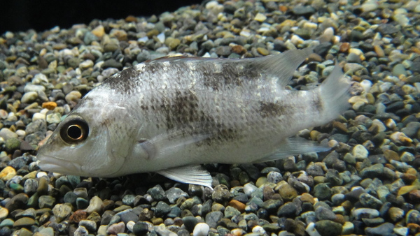 ニューギニア産のフエダイの1種です。モンスターフィッシュマニアの方や釣り好きの方でしたら、ニューギニア産のフエダイと言えば思い浮かべる魚は1つしかないと思います。もちろんパプアンバスですよね!もしかしてパプアンバスの小さいのだったらいいなぁと思い問屋さんにいたの全部仕入れちゃいました!でもこのサイズのパプアンバスなんて見たことないので、こいつの正体は分かりません・・・。魚力がオープンして10年以上たちますが、過去に1度だけパプアンバスが入荷したことがありました。そいつは20cm以上あって、体色はガンメタで体型や体の厚みはもうイメージ通りのパプアンバスのミニチュアみたいな感じでしたね。今回のは10cmもないのでこれからどんな感じに育つのかはわかりませんが、気分によっては体色を黒化させたりして、そんな時はけっこうそれっぽい感じにも見えますね。現在は純淡水でストックしておりますが全然普通で特に問題は無さそうです。気になる方は育ててみてください!!4匹入荷しましたがホームページにアップする前に1匹売約となりましたので残りは3匹です!お急ぎください!!下段の画像です。気分によってかなり体色を変化させます。