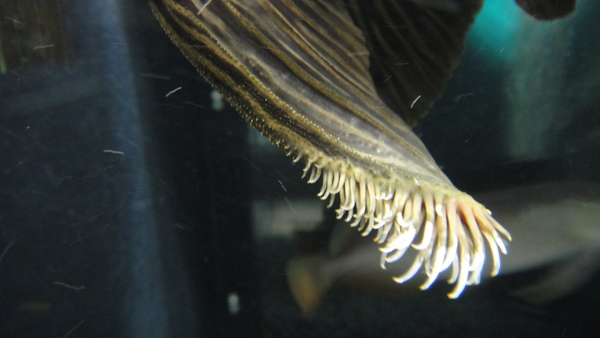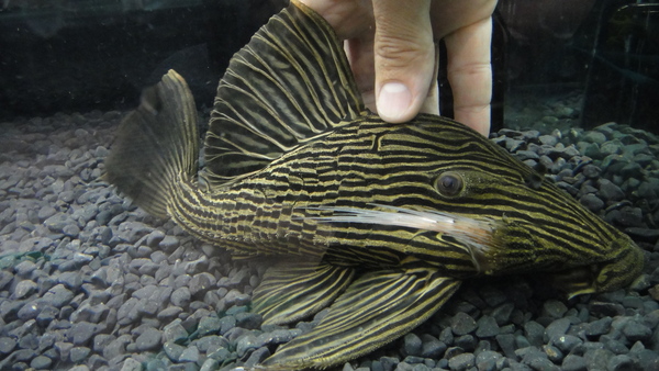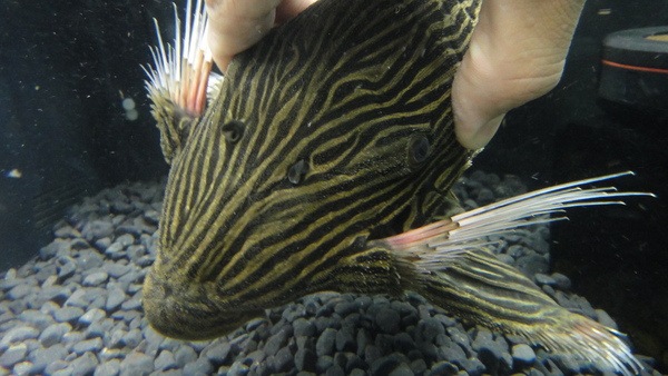これは全然新入荷じゃないんです。新入荷どころか半年以上売れ残ってる長期在庫個体なんです・・・。でも最近すごいことになてきたのでアップしてみました。見てください、このヒゲボーボーの頬と厳つい胸ビレの棘を!ヤマアラシみたいです!!入荷した時はこんなんじゃなかったんですが、飼い込んでたらこうなりました。たぶんあと2~3か月位(長いと半年以上)で頬の棘は抜けますが、また時期がきたらボーボーに生えてきます!なので抜けてもがっかりしないでください!オスでもみんながここまでボーボーになるわけではありません!このクラスは当たり個体です!こういう個体は、生える時は毎回こんな感じでボーボーになりますので、抜けても次のシーズンが楽しみになりますね!長期飼い込み個体に付き状態も良好で、餌も人工飼料をバクバク食べてます!色もキンキンですごくキレイですよ!