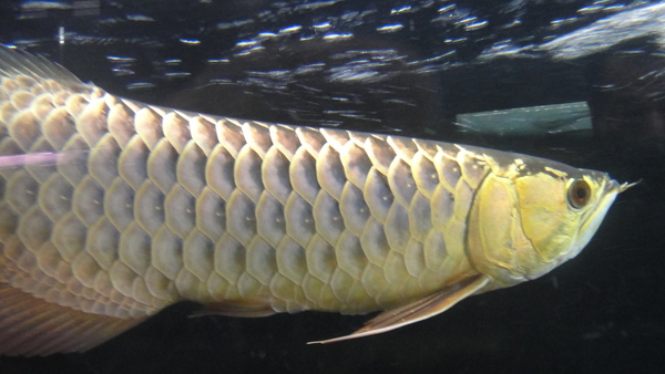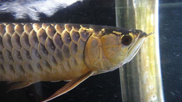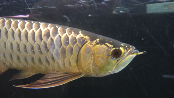 シャンロンアクアティック産のジョホールゴールデンです!下取り個体につき超大特価!金の発色も濃く、鱗底は濃い藍色です!金のあがりは6列目の端が少し光ってる程度ですが、まだ2才半位の若い個体なのでこれからまだまだ金の発色はあがっていくと思います!目垂れ、アゴずれ、エラ捲れはありませんが、前に左の胸ビレが折れてしまったことがあるらしく、まだ少しだけ左の方が短いですが、先までピンとキレイに生えてきています!なのでもうしばらく飼い込んであげれば完全に伸びきると思います!現状でもほとんど分からないくらいに再生していますので、全然気にならないとは思います!スプーンヘッドのハイボディというような今時な感じの個体ではありませんが、濃い金質と胴長な体型が逆に新鮮で、クラシカルな雰囲気からオールドマニアの方に特にオススメです!とてもキレイな個体なので混泳させるのがもったいないくらいですが、店頭では淡水エイやガー、パーチの大きいのと混泳させており、どうも性格は大人しいようなので混泳向きかもしれませんね!?画像は全て同一個体です。左の胸ビレも全然気にならないでしょ!?