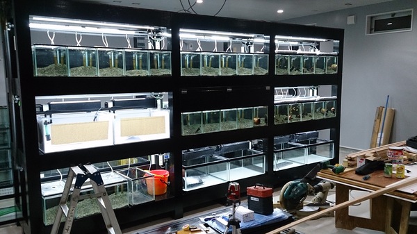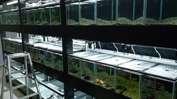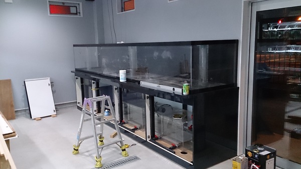 引っ越し大変です!まだ全然終わっていませんが、もう2度としたくないです!水槽の台を移設しながら水槽や魚を移動しているんですが、水槽の台がかなり頑丈なのですごく重たいんです!新店舗の工事をお願いした業者さんに台の移設もお願いしてあるのですが、思っていたよりもはるかに重たいらしくなかなかはかどりません・・・。そんな中とりあえず小さい魚は少し移動させました!あと2400と1500の水槽を設置しました。オーバーフローの配管はほぼ終わりましたが、配管の部品でちょっと足りないのがあったので水を入れるのはもう2~3日後かな・・・?配管が完全に済んだら台に化粧パネルを取り付けます。まだ梱包されたままの新品の水槽だってそのまま放置で、いろいろとやることが山積みです・・・。気が遠くなりそうです・・・。