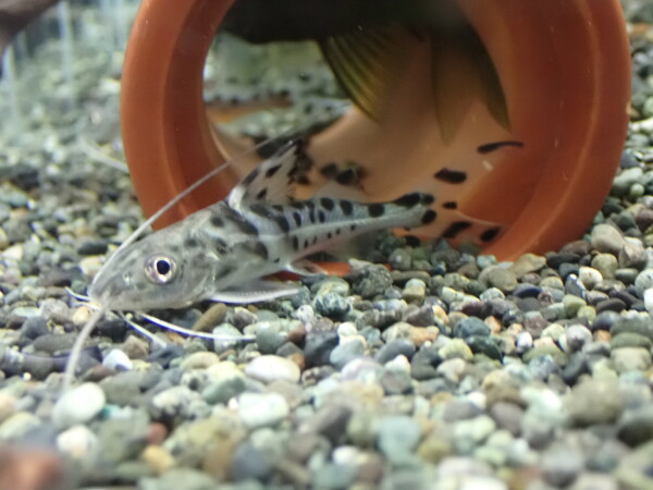 最大で12cmほどなので小さな水槽でも飼育できます。シルバーの体色に黒い水玉模様がとてもキレイ。小さくてもピメロディアらしいかっこいいシルエットでサイズ以上に存在感のある魚です。丈夫で飼いやすいし値段もお手頃でオススメのナマズです。中段右の画像です。