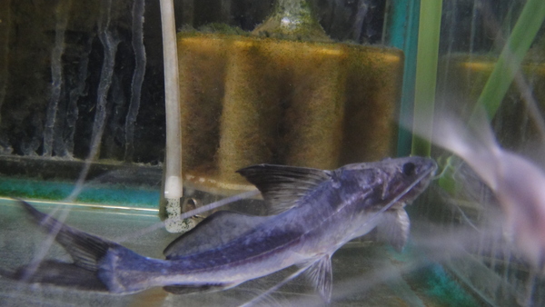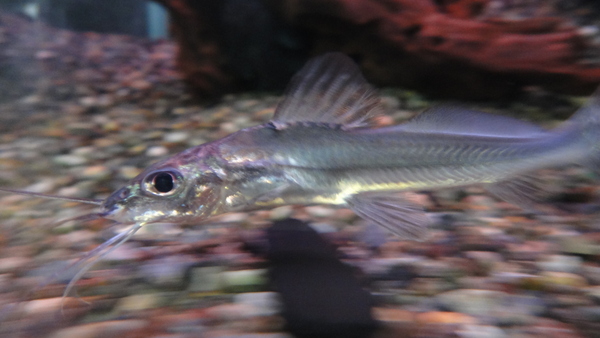 上記のバルバードに混じって1匹だけ輸入された謎のナマズです。片方の胸ビレが欠けて少し小さくなってしまっていたので安くしてもらいました。でもちゃんと生えてきていますので完全に再生するのも時間の問題だと思います。詳細は分かりませんが、口が少し下を向いていてベルギアリア属のナマズに似てます。でもベルギアリアはパラナ水系産でペルーにはいないはずなので、ベルギアリアではないはず・・・。体はシルバーでややロングボディ、顔は短めで口はやや下向きです。良く分かりませんがスーパーマニアの方、こんなナマズいかがですか??右上の画像です。